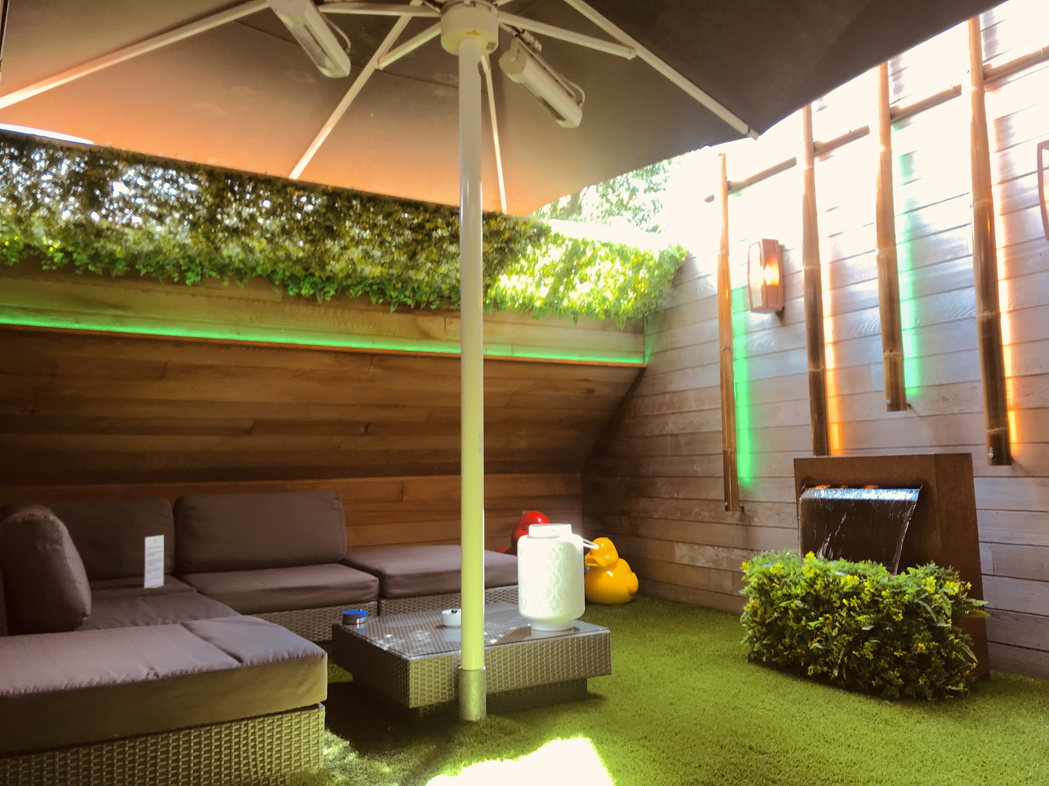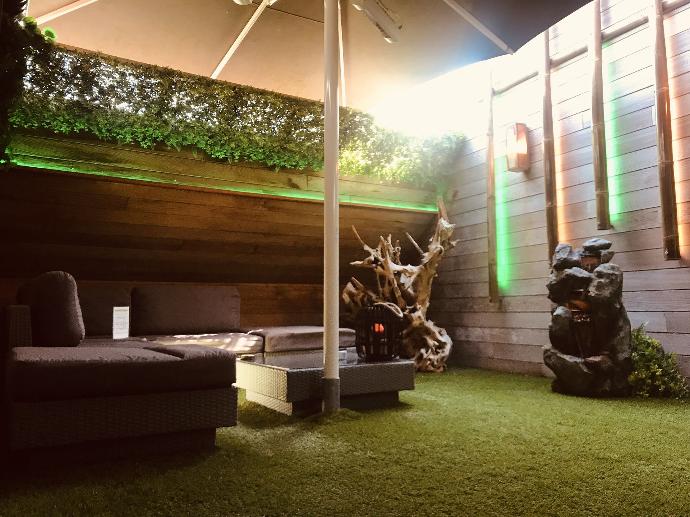 - Overdekt door een grote permanente parasol met infraroodverwarming.